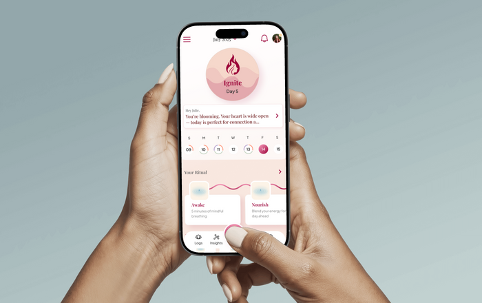 Ritual Kit + App — holistic body, mind & energy rituals that blend science with natural practices, paired with personalised non-hormonal beverage blends. Built around NHS-style symptom language (40+), with GP-ready notes you can share.