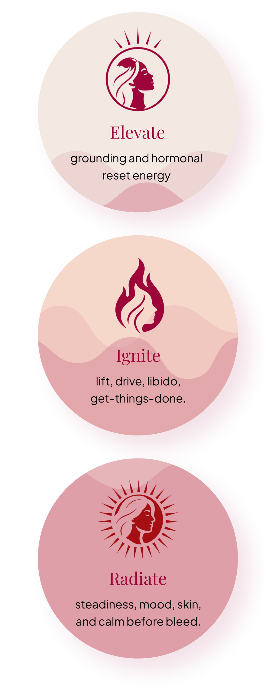 Cyclic Intelligence™(Elevate → Ignite → Radiate) aligns rituals and blends to your rhythm.
